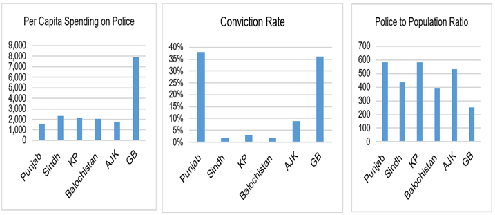 Gilgit-Baltistan (GB) has the highest per capita police spending and Pakistan’s best police-to-population ratio (1:252). The 67 police stations cover a population of 1.49 million. According to the GB government, 18 persons were convicted out of 50 disposed cases, resulting in a conviction rate of 36%, second to Punjab.