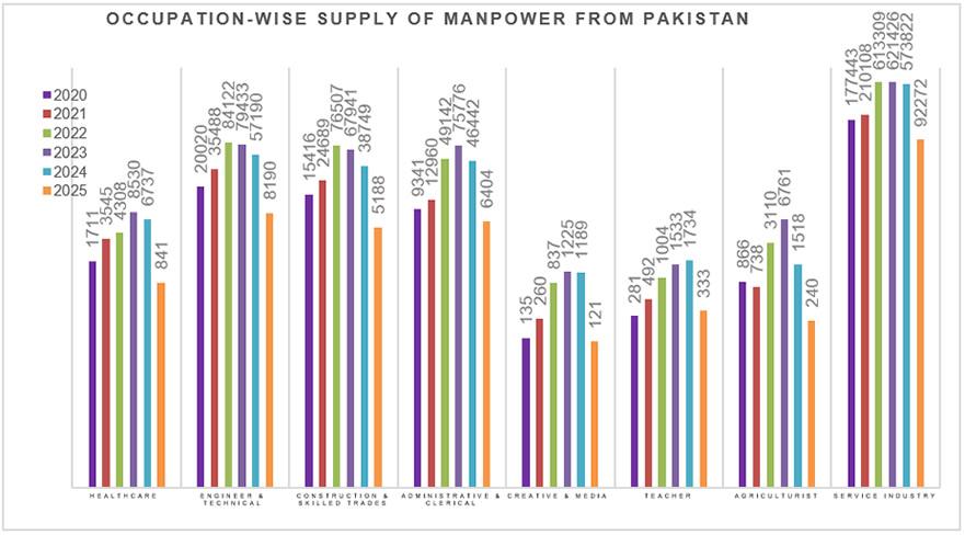The graph highlights fluctuations in manpower exports, with a steady increase in labour exports from 2020, peaking in 2022 & 2023, with unskilled and skilled workers making up the largest share, but it also indicates a sharp decline in 2025. However, the region wise supply of manpower indicates that the Middle Eastern region has been the top destination for Pakistani manpower, with KSA absorbing the highest number. While Middle Eastern nations continue to be the primary labour markets, migration to non-traditional markets in Europe, Africa, and East Asia remains marginal as shown in the graph below.