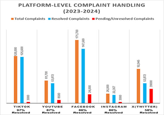 The lack of local offices results in poor content moderation, as remote teams often lack cultural awareness—consequently, Pakistan resorts to disruptive measures like nationwide bans, which negatively impact millions of users. Graph 2 below shows the status of complaints processed by these major SMNs. As of 2024, TikTok had the highest content removal rate (98% resolved), while X (Twitter) was the worst performer (only 58% of complaints resolved).