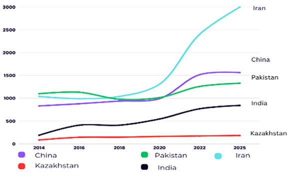 India has gradually increased its role, though it remains behind the top three partners. Kazakhstan’s share has stayed small but steady. Overall, the trajectory signals a reorientation of Afghan trade toward Iran and China, with Pakistan facing growing competition.