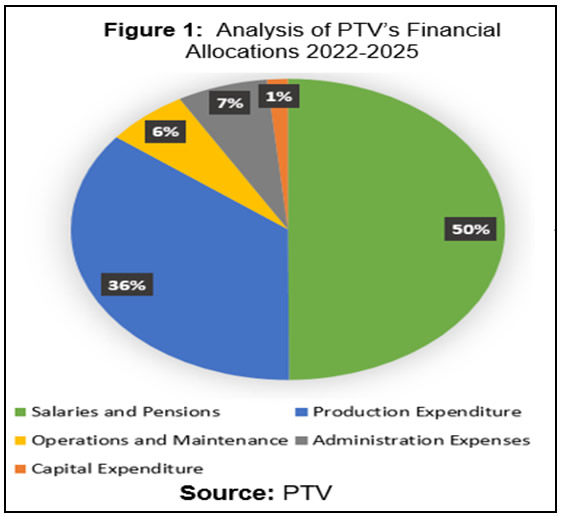 Central to PTV’s underperformance are deep financial imbalances. Over the past three years, it operated with an average annual budget of PKR 17 billion, nearly 50% of which is spent on salaries and pensions for over 4,200 employees, while just 35% was allocated to production and only 1.5% to infrastructure and technology. In contrast, the BBC spends only 18% on personnel and 51% on content production, reflecting a content-first strategy. This imbalance reflects misplaced priorities, where PTV is geared more toward sustaining the institution than producing quality content, thus hampering its competitiveness in the evolving media environment.