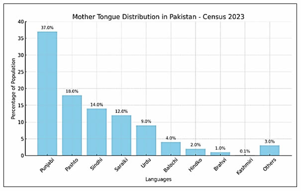 The 2023 report by the Pakistan Bureau of Statistics (PBS) reveals that Punjabi remains the most widely spoken language, with 37% of Pakistanis identifying it as their mother tongue, followed by Pashto (18%), Sindhi (14%), Saraiki (12%), and Balochi (3%). Other regional languages account for 6% of the population. Urdu, the national language, is the mother tongue of 9% of Pakistanis. Nevertheless, Urdu serves as the primary means of communication, acting as a lingua franca that fosters interaction between different regions, thereby promoting national cohesion.
