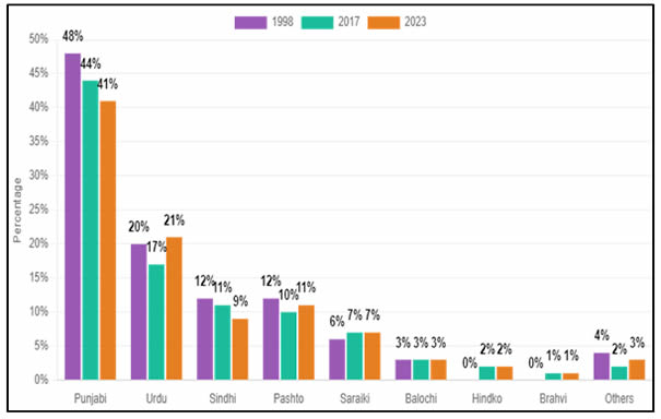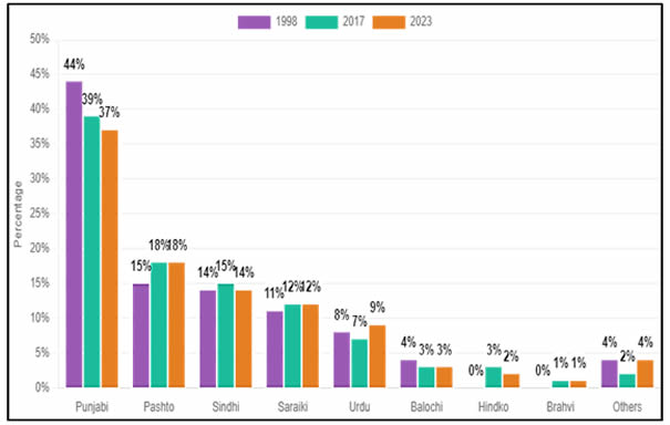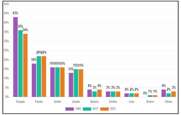 Sindhi speaking fluctuated, peaking at 15% in 2017 before reverting to 14% in 2023. Balochi speaking has declined steadily, dropping from 4% in 1998 to 3% in 2023. Demographic changes, urban migration, and economic mobility shape these linguistic patterns.